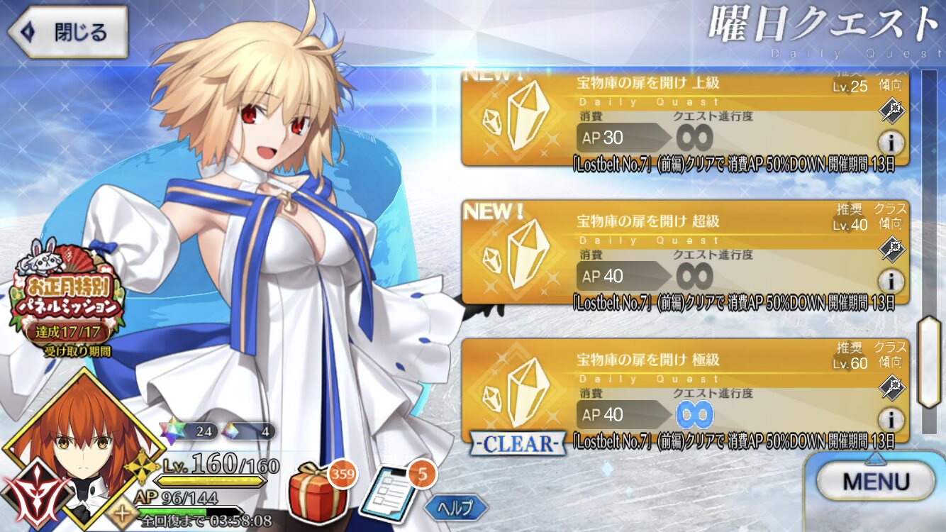 幕間と強化クエスト、あと宝物庫のAP半減か。地味に助かる。