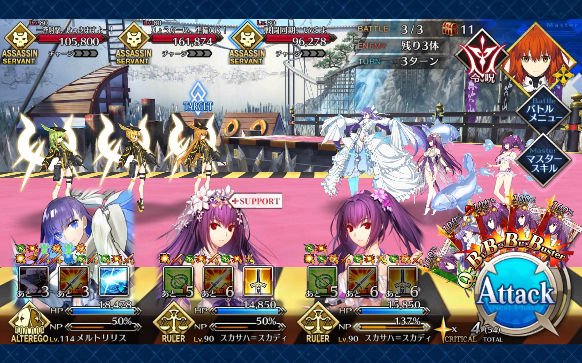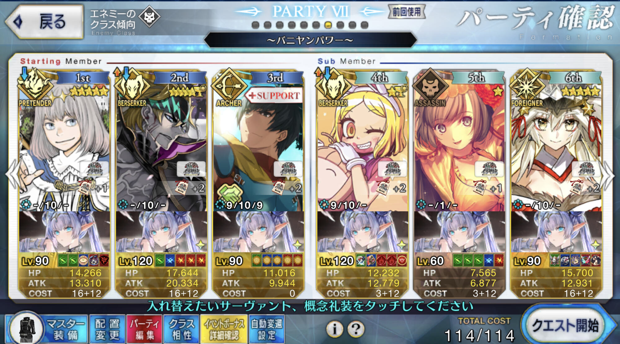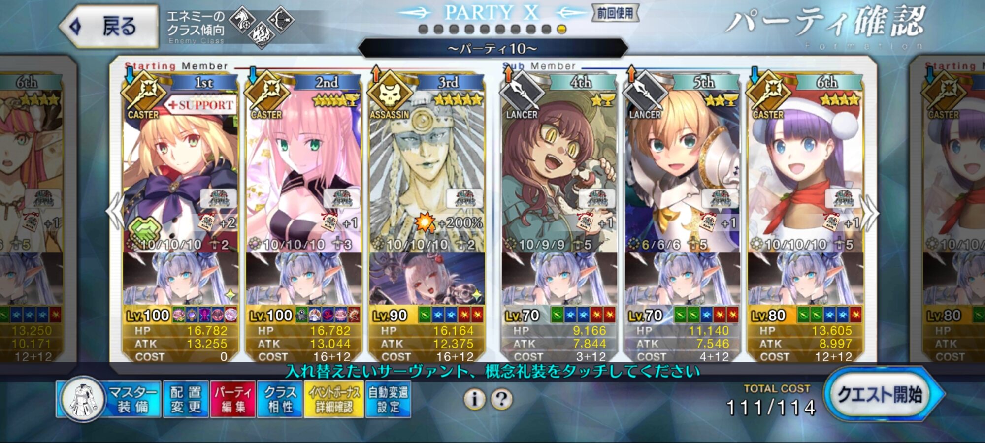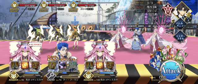 あと、マスター礼装は決戦用カルデア制服で、前衛3人には全員凸ウィナーズ、水着ノッブがアペンド2開放済で、ポカニキのアペンド2がMAXである事が必要な条件かな?