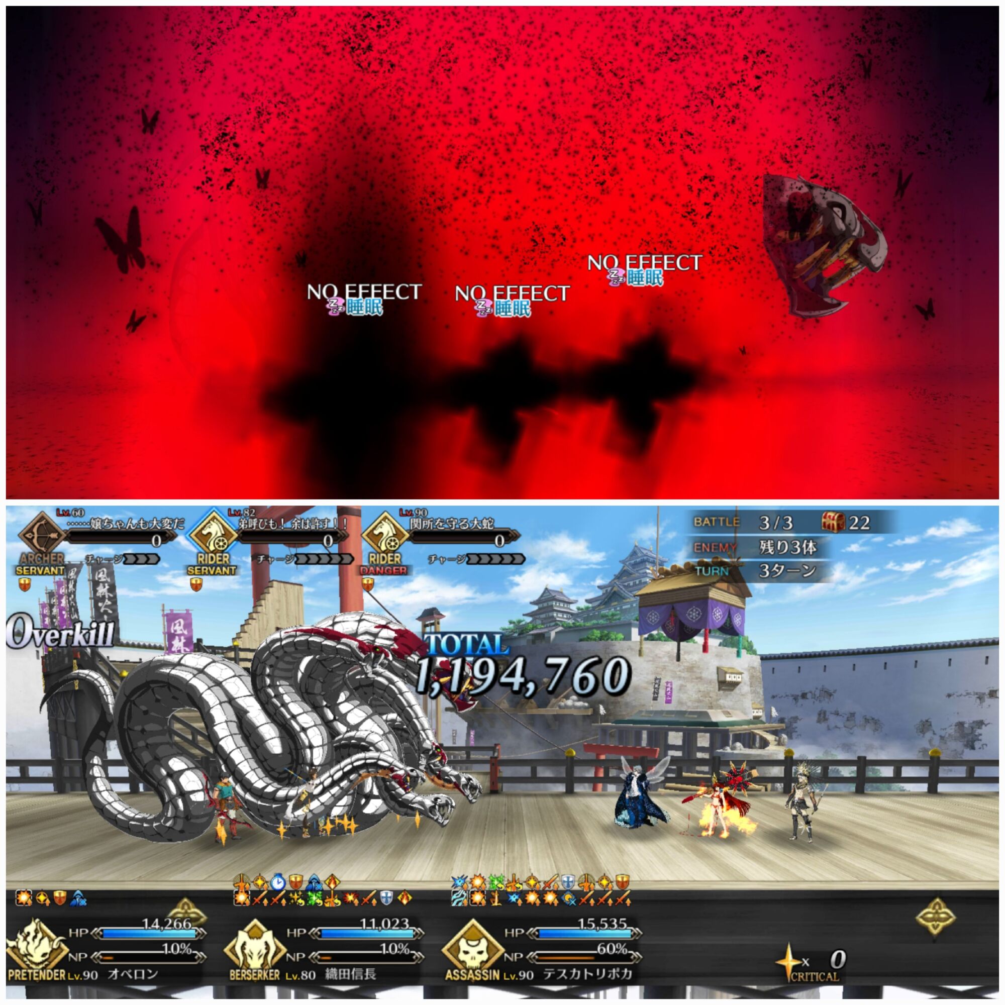 2ターン目コヤンバフとオベロンS1で強化して千年城。この際、姫君のNPをオダチェンでコヤンと交代した刑部姫で補う