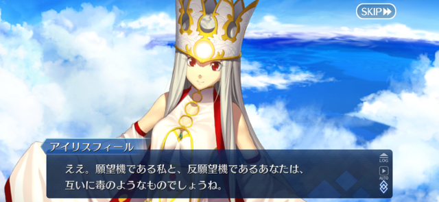 真面目なシナリオでアイリさんの活躍は久しぶりですね。あとサーヴァントのアイリさんとは別に、AZOでアイリスフィールを保護していたことも思い出しました。あれから登場していないのですけども。