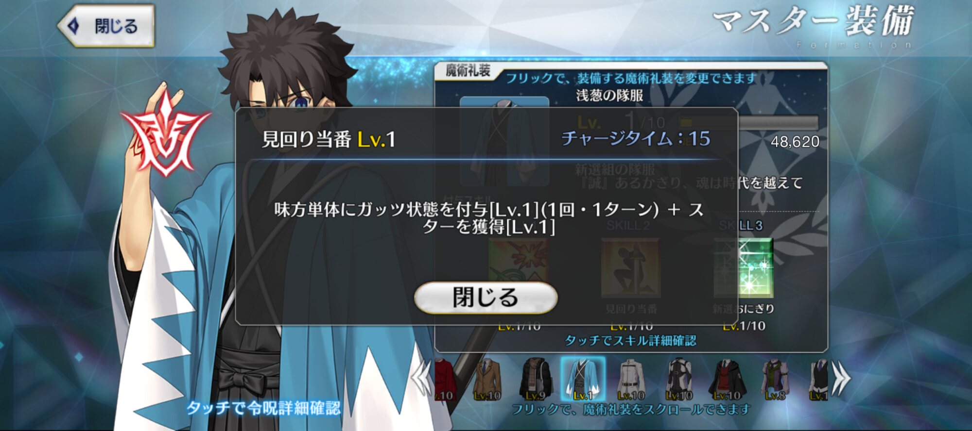 魔術礼装として実現しないかなと思ってたので今回の「浅葱の隊服」は本当に嬉しい。性能も新選組サーヴァントと相性がいうのも一緒に戦う隊士っぽくていいですよね。