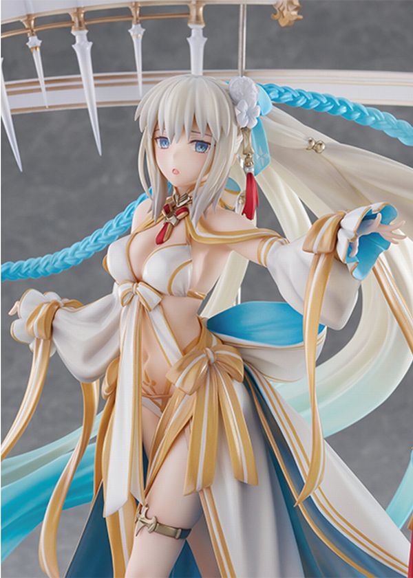 キャスタークラスとして新たな霊基を得たモルガンが、水着姿で立体化。 白と金を基調としたドレスのような水着姿からは、水妃としての気品と、夏の開放感を感じることができます。 頭部に浮かぶ円形装飾の造形や、流れるような髪のグラデーション塗装など、細部までこだわっています。
