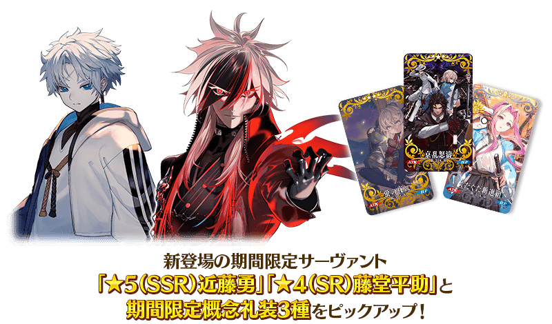 期間限定イベント「幕末チャンバラ神話 ぐだぐだ新選組・ジ・エンド REVENGE OF MAKOTO」の開幕を記念して、新登場の期間限定サーヴァント「★5(SSR)近藤勇」「★4(SR)藤堂平助」と期間限定概念礼装3種をピックアップ!