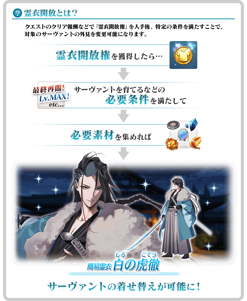 期間限定イベント「幕末チャンバラ神話 ぐだぐだ新選組・ジ・エンド REVENGE OF MAKOTO」の報酬として、「★5(SSR)近藤勇」の簡易霊衣「白の虎徹」の開放権が登場! 本イベントでは、特定のクエストをクリアすることでイベントアイテム交換にて上記の簡易霊衣開放権を入手できます。 また、霊衣を開放するには、霊衣開放権に加え、いくつかの条件を満たす必要があります。