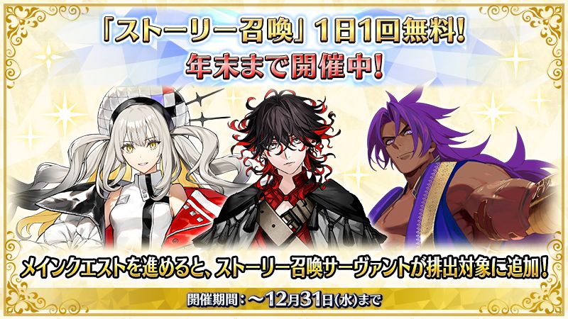 特定のメインクエストをクリアすることで召喚可能となる「ストーリー召喚サーヴァント」も召喚対象となりますので、毎日忘れずに召喚しましょう!… pic.twitter.com/TbDLj5S3SO