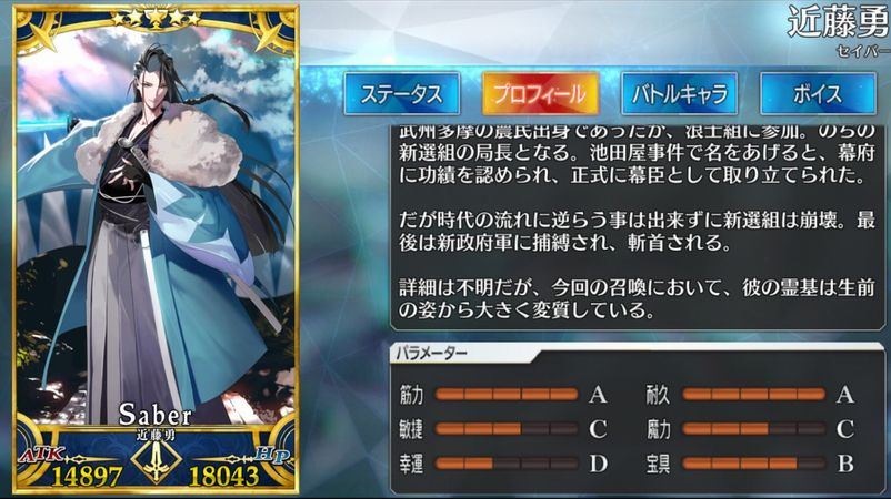 【FGO】新選組サーヴァントにはステータスの高い英霊も居る。近藤勇は筋力A・耐久Aとフィジカルが強いステをしている