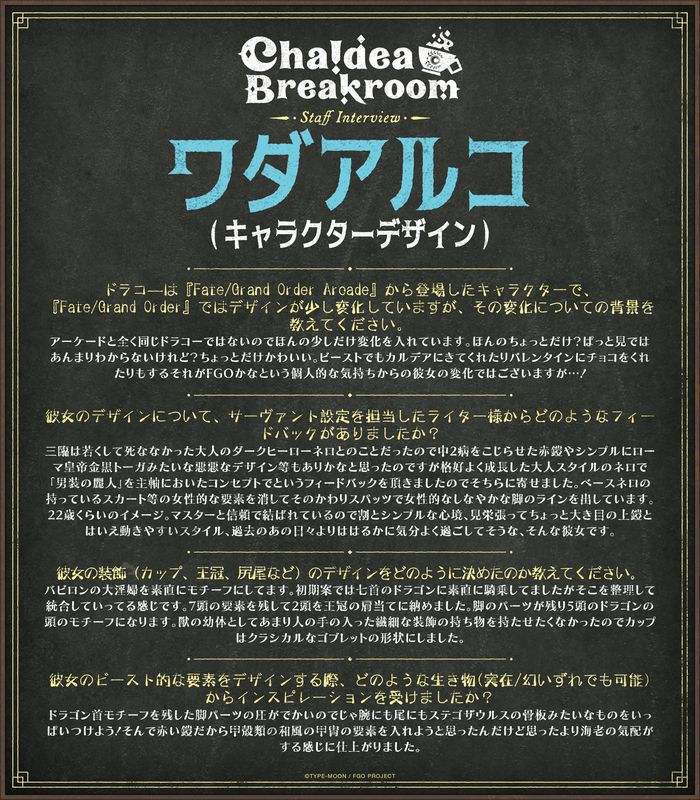 Chaldea Breakroom Vol. 39 Japanese Edition is here! 今回はソドムズビースト/ドラコーをフィーチャー!そしてキャラクターデザインのワダアルコさんの独占インタビューも掲載!#ChaldeaBreakroom ではサーヴァント特集&FGOのスタッフ独占インタビューを配信!https://t.co/dp0yoQULOT#FateGOUSA pic.twitter.com/NnHaZUPkZJ