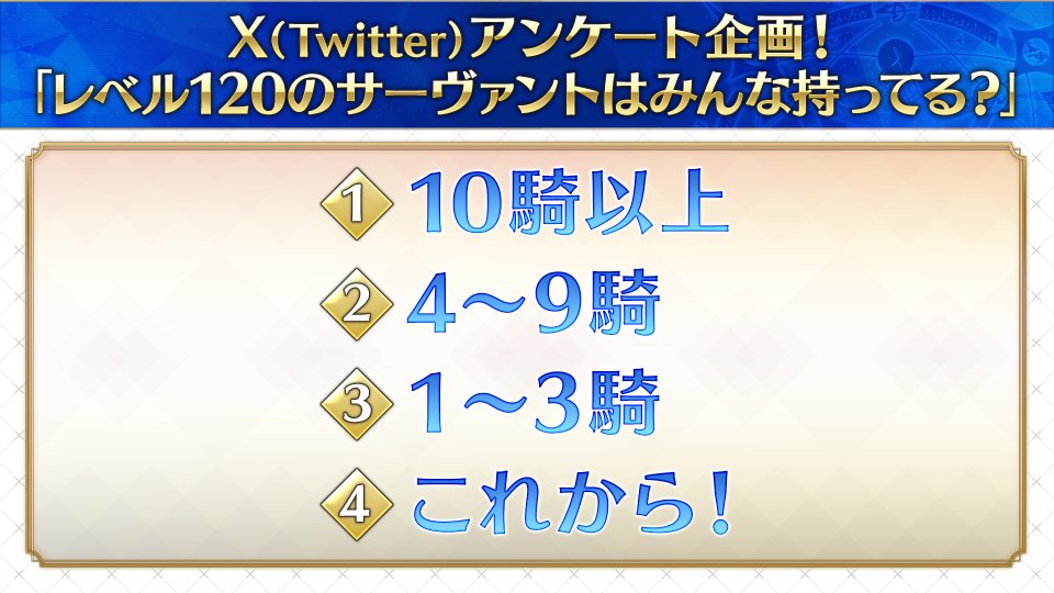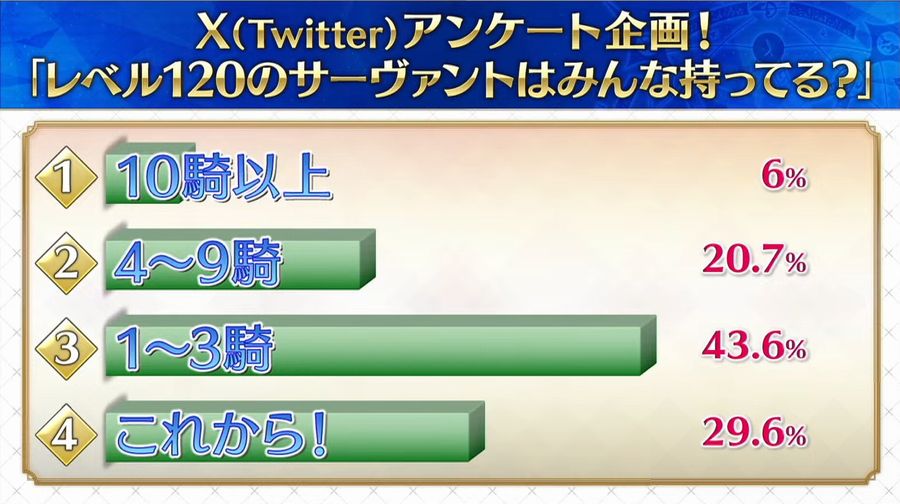 FGOラジオ参加型アンケート企画「レベル120のサーヴァントはみんな持ってる?」結果発表。1〜3騎というマスターさんが一番多くて育成の大変さを実感する
