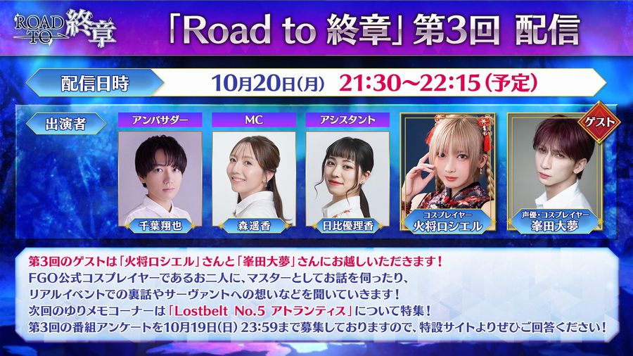 本日10月20日(月)21:30から、全マスターの「第2部 終章」到達を応援するトーク番組「Road to 終章」第3回を生配信!