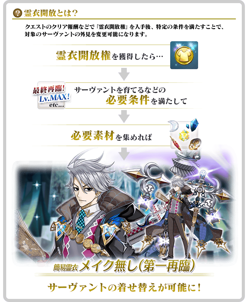 「★5(SSR)ジェームズ・モリアーティ(ルーラー)」の簡易霊衣「メイク無し(第一再臨)」の霊衣開放権をダ・ヴィンチ工房の「霊衣縫製」に追加! マナプリズムと交換することで、霊衣開放権を入手できます。 また、霊衣を開放するには、霊衣開放権に加え、いくつかの条件を満たす必要があります。