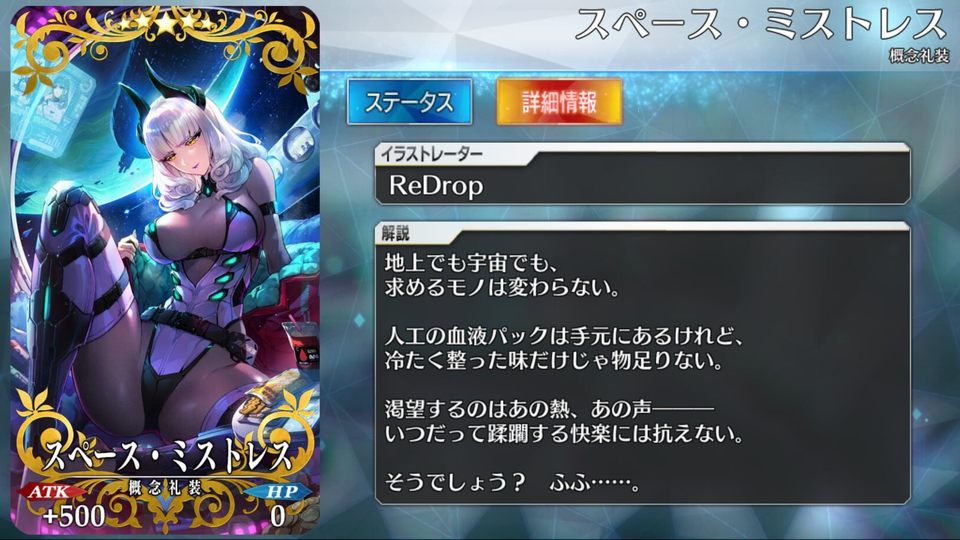 そしてお馴染みではありますが、このカーミラ様もちょっと刺激的な格好すぎますね。モニターやら後ろのほうも気になってはいましたが…スペースデンジャラスビースト…ですと!?このコスは宇宙に進出していたのか…!ところでこの概念礼装ですが管理人もバッチリ引いてますよ!