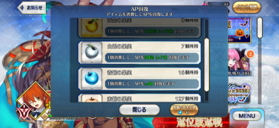 100~200の間を行ったり来たり。漏れそうなAPは躊躇無く青リンゴにして、イベントは自然回復分でまたーりとやって溜め込んで、BOXやレイドや戴冠でまた減って……