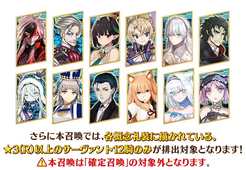 ※本召喚では全日程で★3(R)以上の上記サーヴァントのみが排出対象となります。「★1(C)シャルロット・コルデー(アサシン)」、「★1(C)アステリオス」は排出対象ではないのでご注意ください。