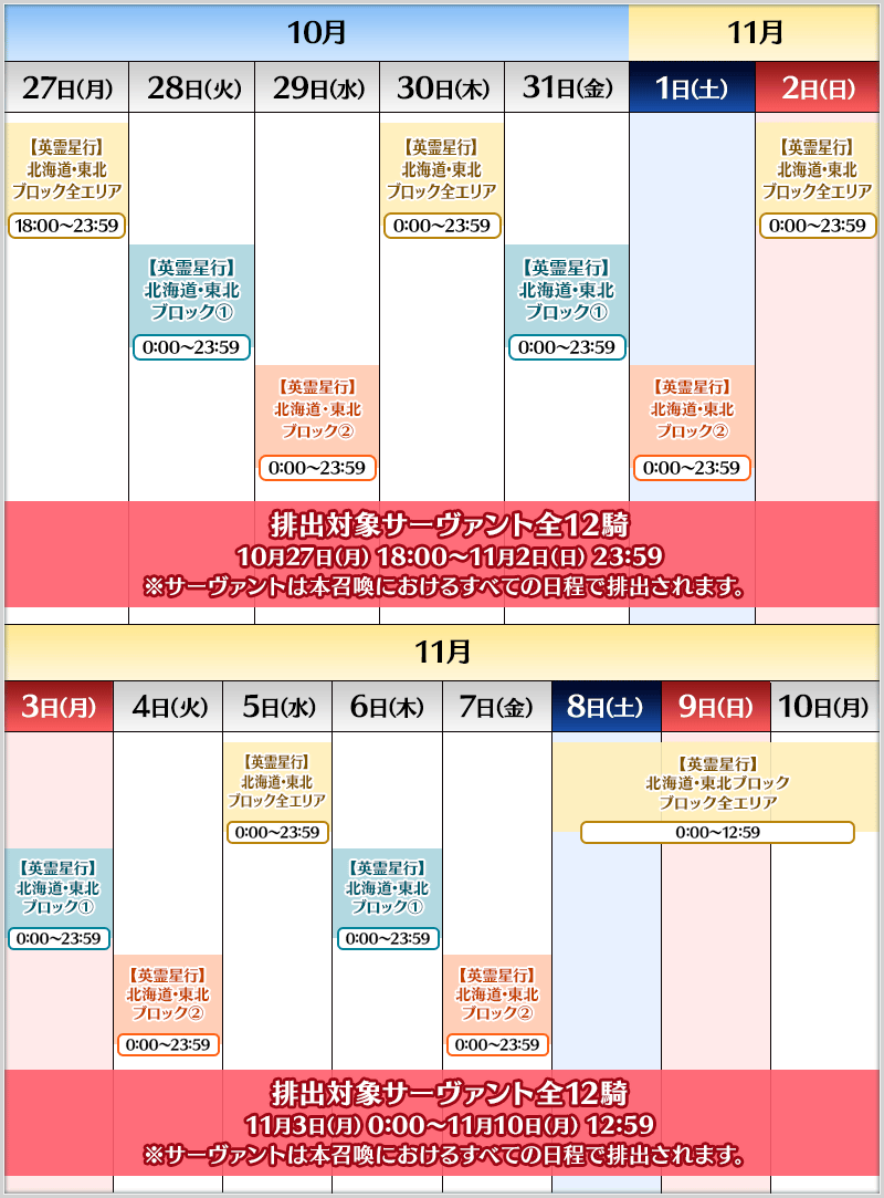 「Fate/Grand Order」10周年を記念して実施している記念企画「OVER THE SAME SKY」。 その描き下ろしイラストのうち、「北海道・東北」ブロック14種類の特別概念礼装「英霊星行」をピックアップする3種類の召喚を開催! また本召喚は日替り開催となり、特別概念礼装のピックアップ対象は日ごとに切り替わります。 さらに本召喚では、各概念礼装に描かれている★3(R)以上のサーヴァント12騎のみが排出対象となります!