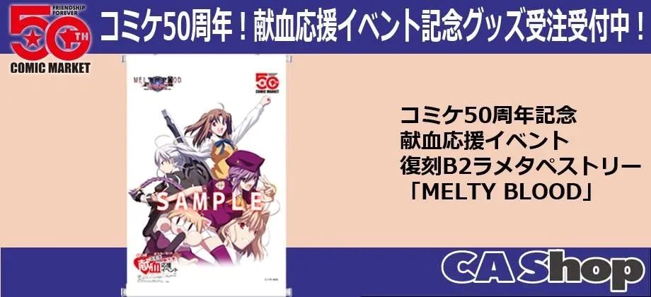 【コミックマーケット107】コミケ50周年を記念して初期の献血応援イベント話題になった限定ポスターをラメ入りタペストリーとして復刻。C81第1回で協力されたTYPE-MOON「MELTY BLOOD」も復刻グッズとして受注販売