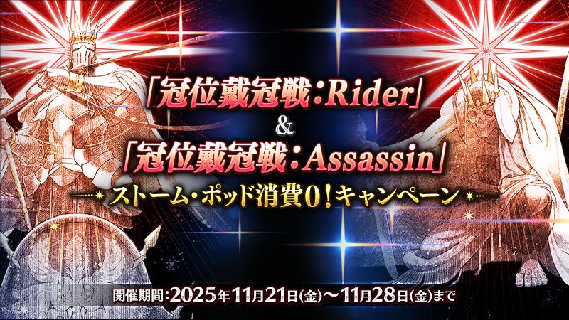 2025年11月21日(金) 18:00~11月28日(金) 12:59まで「冠位戴冠戦:Rider」と「冠位戴冠戦:Assassin」の「冠位研鑽戦」に挑む際の「ストーム・ポッド」の消費が0になります。