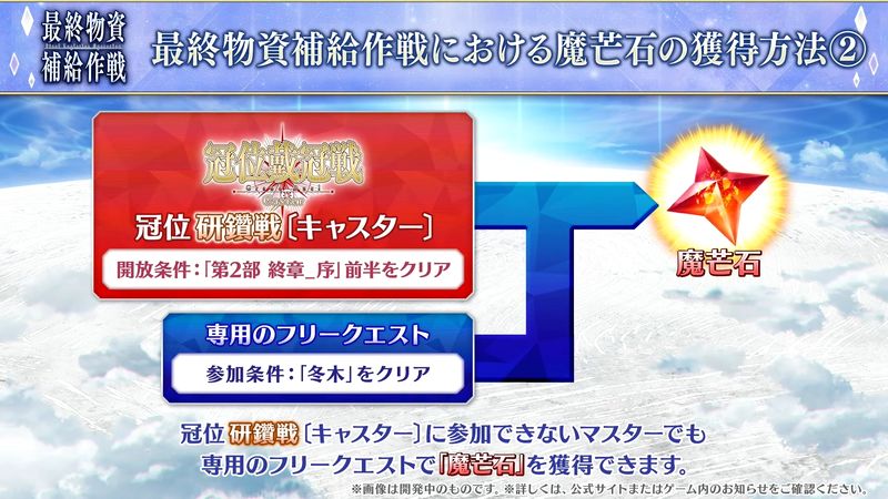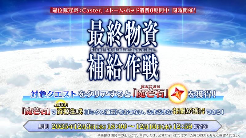 ※「第2部 終章_序」の開放条件を達成できず、「冠位戴冠戦:Caster」に挑めない場合でも、2025年12月3日(水) 18:00~12月10日(水) 12:59まで開放される「最終物資補給作戦」のフリークエストで「魔芒石」を集められます。