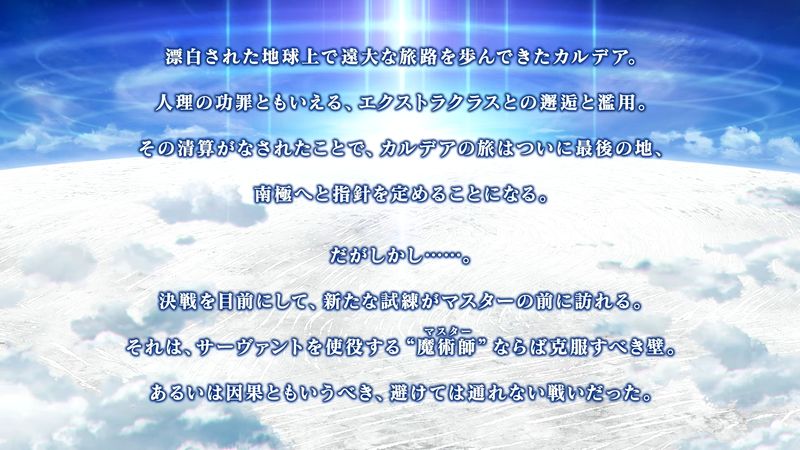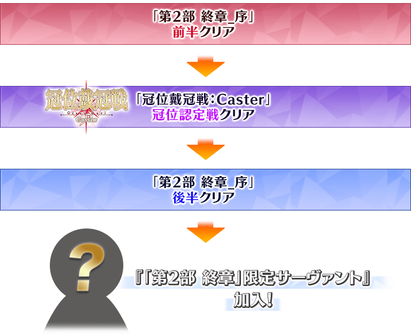 「第2部 終章_序」は前半と後半に分かれており、前半をクリアすることで「冠位戴冠戦:Caster」に参加できるようになります。 また後半を開放するには「冠位戴冠戦:Caster」の冠位認定戦のクリアが必要です。