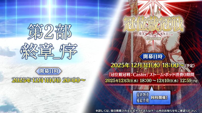 メインストーリー第2部 終章への導入章となる「第2部 終章_序」が2025年12月1日(月)に開幕! あわせて「冠位戴冠戦:Caster」も2025年12月3日(水)に開幕予定!