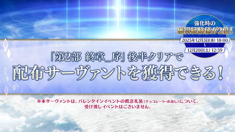 さらに、「第2部 終章_序」後半をクリアすることで『「第2部 終章」限定サーヴァント』が加入します。 終章へと続く最後の試練を乗り越えて、来る決戦に備えましょう!