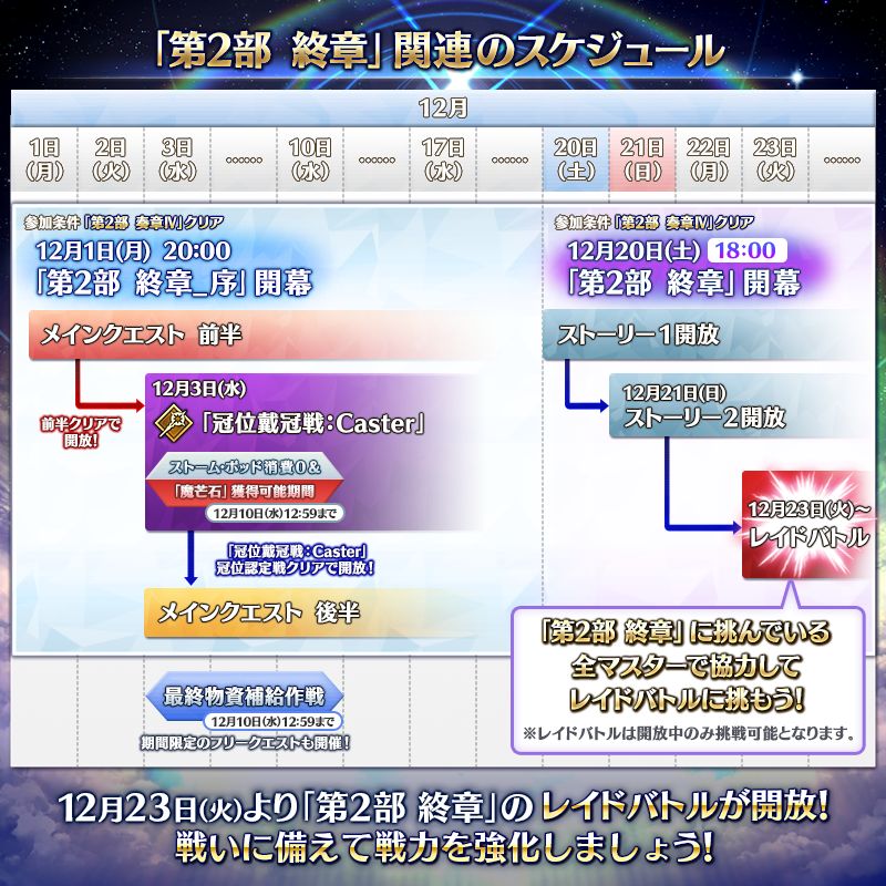 【FGO】「第2部 終章」関連のスケジュールが公開!12月20日(土)18時より開幕で12月23日(火)よりマスター全員で強力なエネミーを撃退する「レイドバトル」が発生!