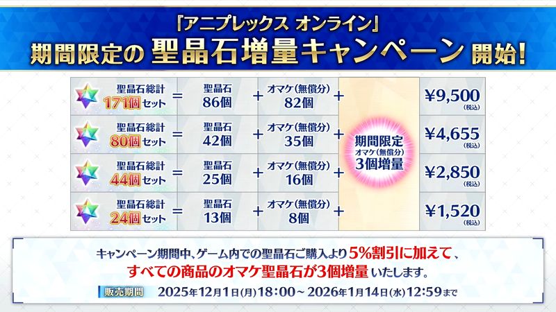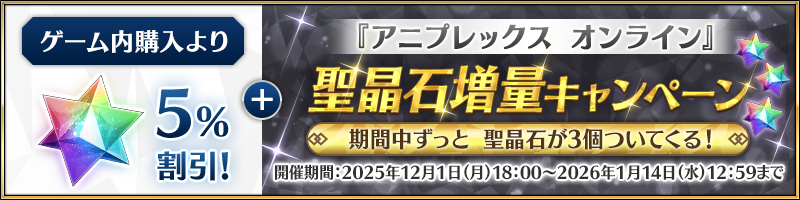 2025年12月1日(月)より期間限定で、『アニプレックス オンライン』のすべての商品の聖晶石が3個増量するキャンペーンを実施いたします。 キャンペーン期間中、ゲーム内での聖晶石ご購入より5%割引に加えて、すべての商品のオマケ聖晶石が3個増量いたします。
